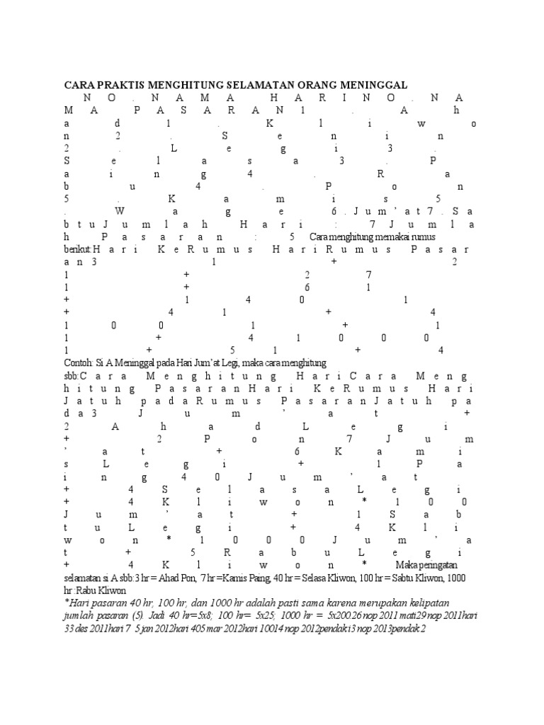 Menghitung Selamatan Orang Meninggal - Rumus Matematika Rumus Menghitung 1000 Hari Orang Meninggal Matematika Mania / Diposting 28th march 2013 oleh id awan.. Kebudayaan selamatan orang yang sudah meninggal dilakukan sebanyak 8 kali terhitung sejak orang tersebut meninggal. Yang mana untuk selamatan geblag adalah proses kirim doa untuk orang meninggal yang mana dilaksanakan. Maksudnya, kalau orang meninggal dunia pada hari jum' at kliwon karenanya selamatan mitung dina jatuh pada hari kemis legi. Cara praktis menghitung selamatan orang meninggal no. Minggu pahing 20 november 2011 selamatan pendhak i (354 hari) meninggal :