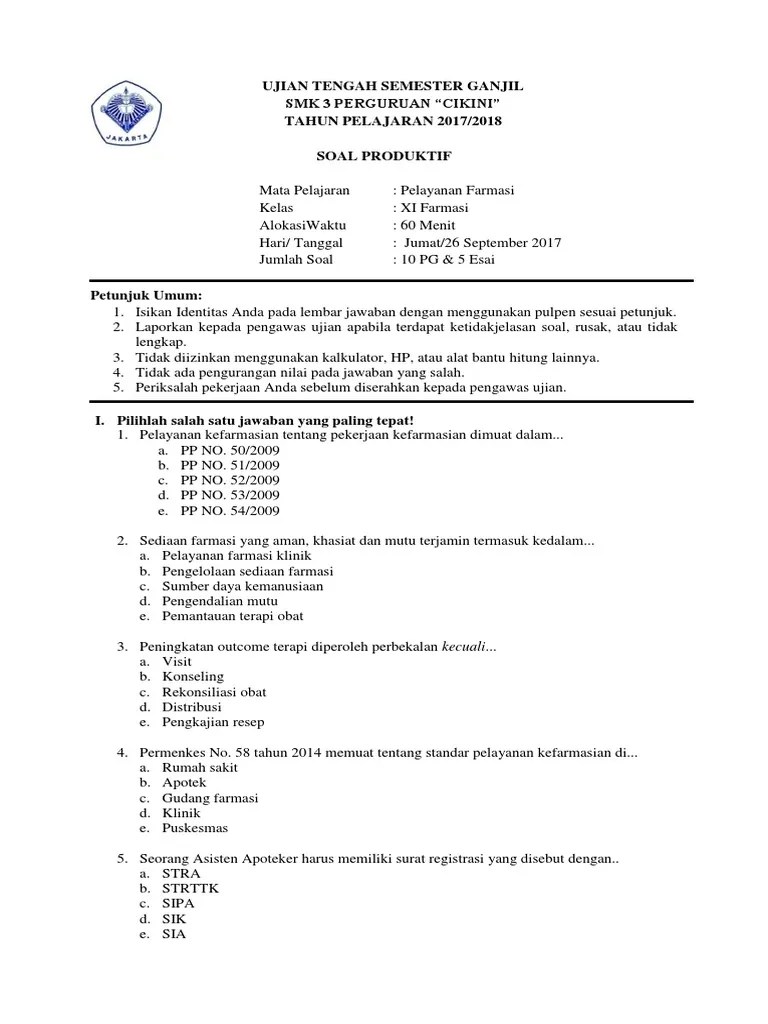 November 20 2019 oleh smk dipo. 40 soal tentang seo & soal yang akan dibagikan adalah soal farmasi kelas 10 kelas 11 dan kelas 12 semester 1 yang sudah menggunakan kurikulum 2013. soal farmasi kelas x semester i kelas x/ilmu resep susanti erikania, s.farm., apt apotek smk pgri Pada jenjang sekolah menengah kejuruan (smk) terdapat berbagai jurusan diantaranya teknik otomotif, teknik komputer jaringan, administrasi perkantoran, akuntansi, multimedia, perhotelan, pertanian, teknik permesinan, teknik kelistrikan, farmasi dan masih ada yang lainnya.